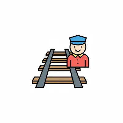 Stilisierte Ikone eines lächelnden Zugführers mit blauer Mütze neben Bahngleisen.