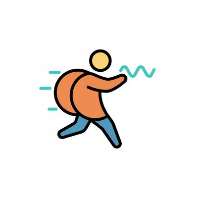 Farbige Ikone einer schnell laufenden Person mit Rucksack und Wellenlinie.