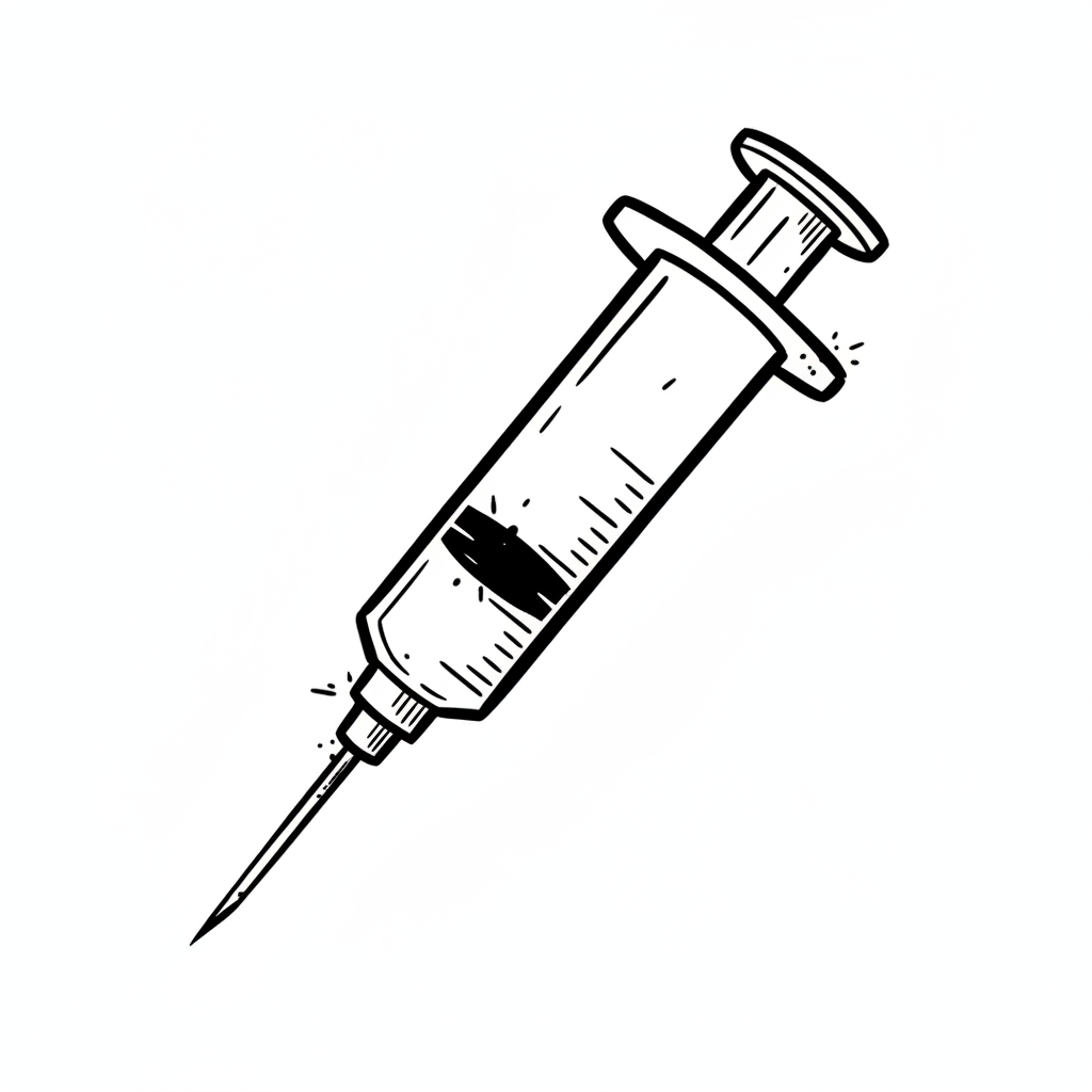 Schwarz-weiße Strichzeichnung einer Spritze mit Nadel und Flüssigkeit.