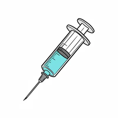 Gezeichnete Spritze mit blauer Flüssigkeit und Nadel auf weißem Hintergrund.
