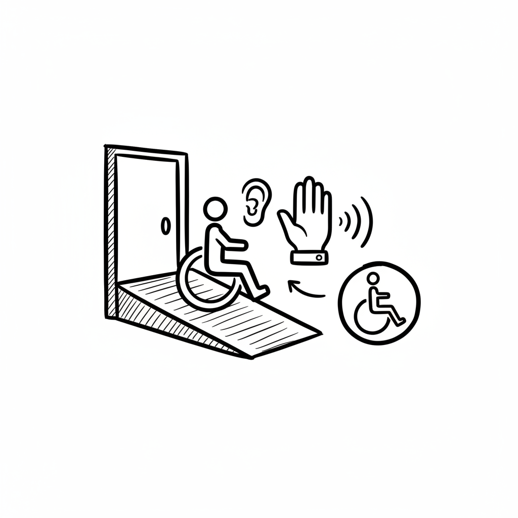 Skizze: Rollstuhlfahrer auf Rampe, Tür, Ohr, Hand mit Schallwellen. Zeigt Barrierefreiheit & Inklusion.