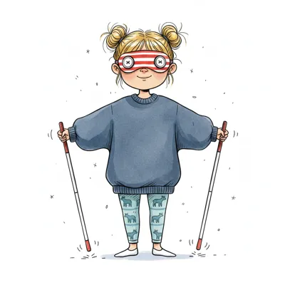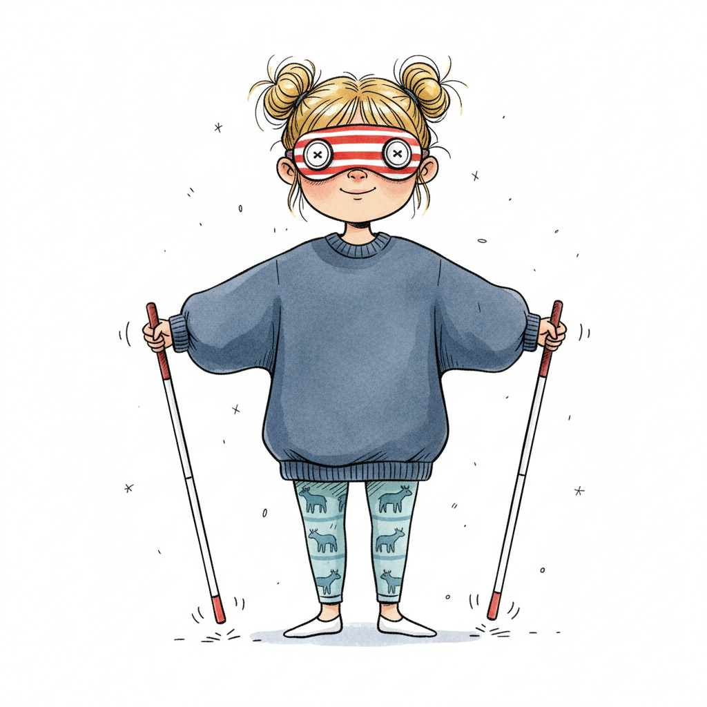 Ein lächelndes Cartoon-Mädchen mit Augenbinde und zwei Blindenstöcken in den Händen.