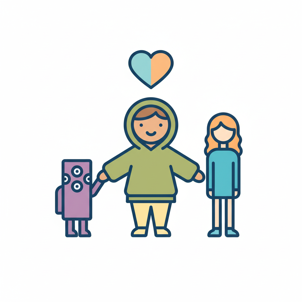 Buntes Icon: Eine Person hält Hände mit einem Alien und einer Frau, Herz symbolisiert Liebe/Einheit.