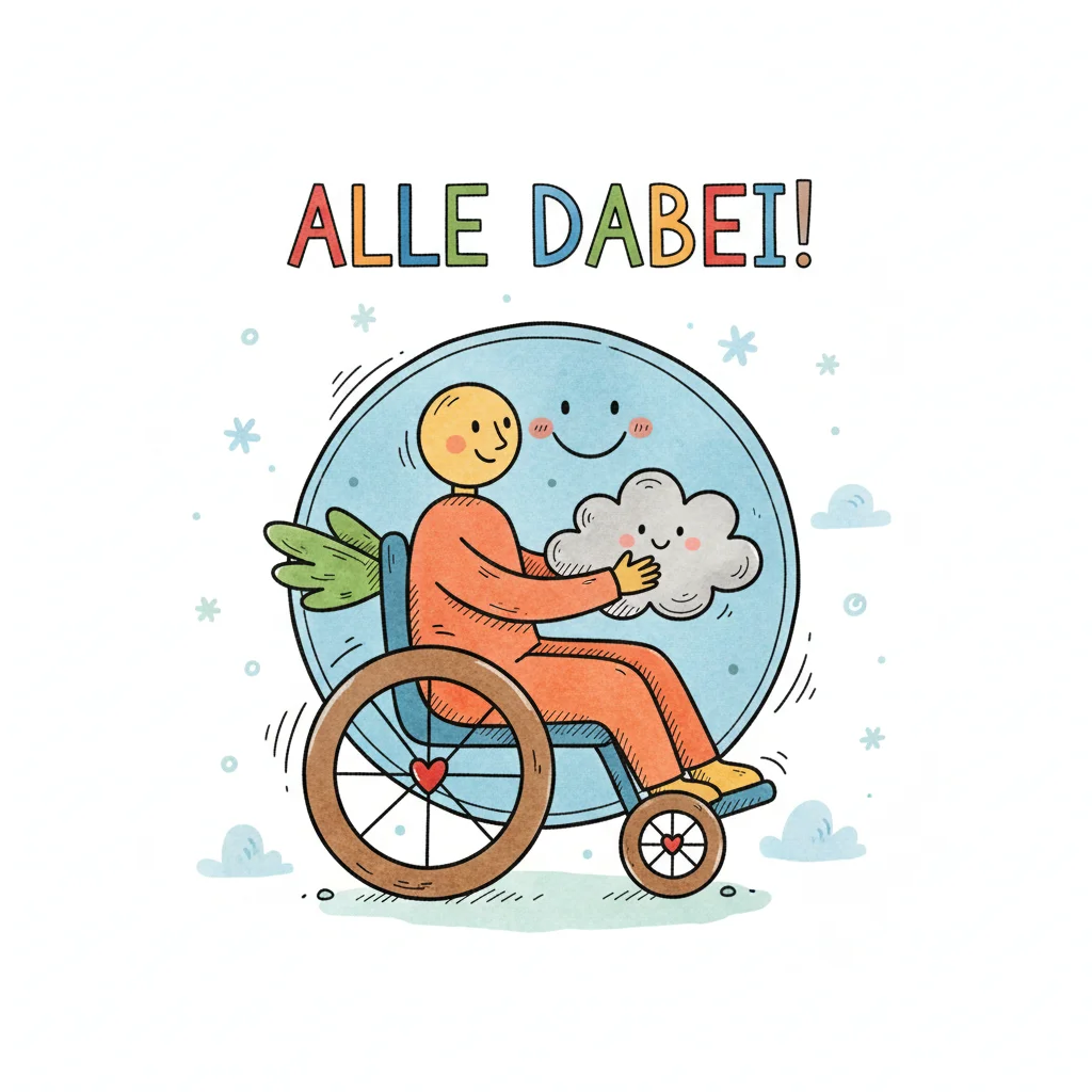 Fröhliche Cartoonfigur im Rollstuhl hält Wolke, umgeben von einem lächelnden Kreis. Text: ALLE DABEI!