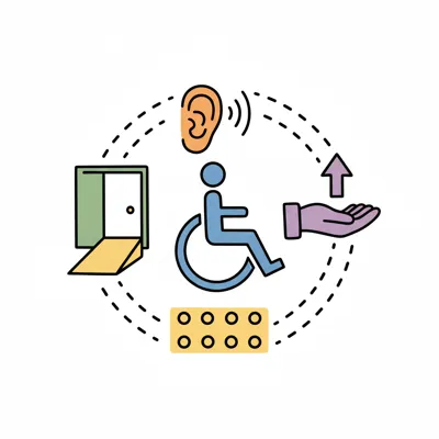 Illustration von Barrierefreiheitssymbolen: Rollstuhl, Hörhilfe, Rampe, Braille, Unterstützung.