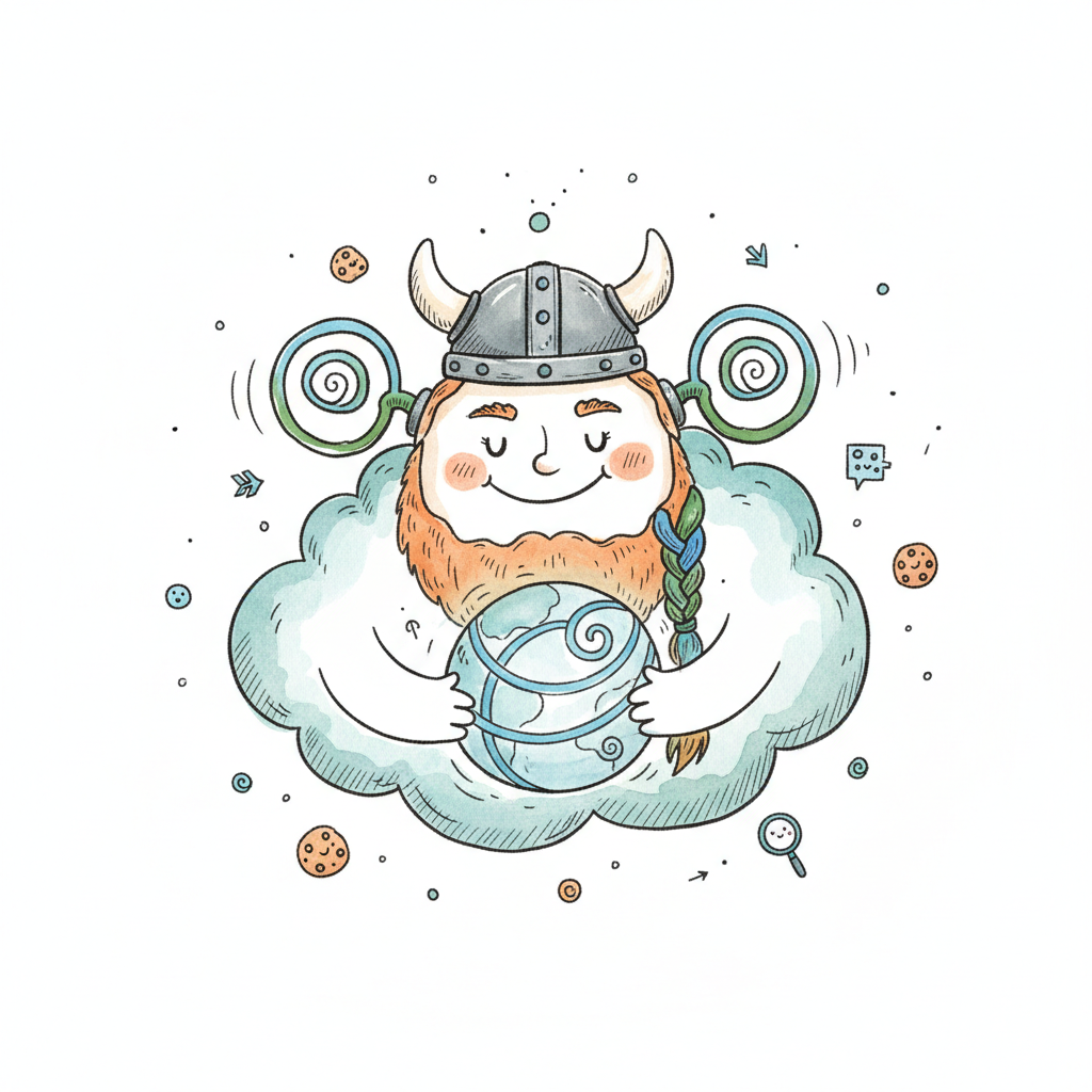 Ein lächelnder Wikinger auf einer Wolke hält die Welt, umgeben von Symbolen wie Cookies und Spiralen.