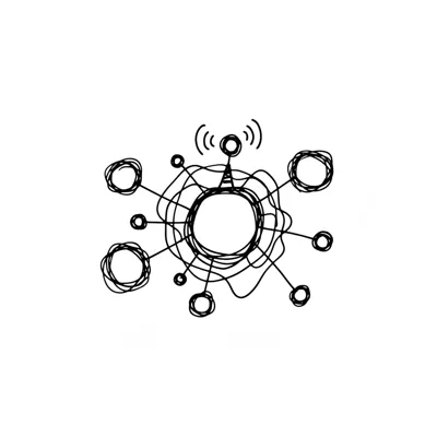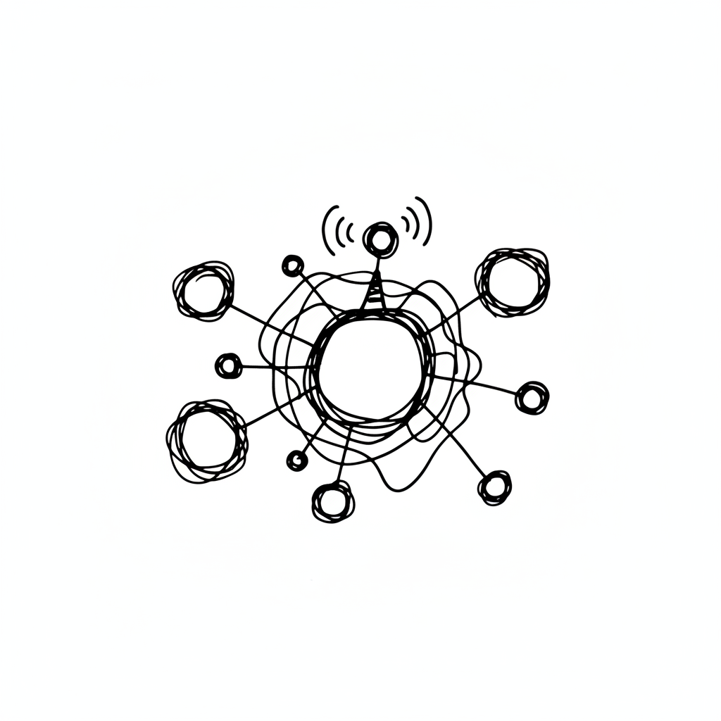 Handgezeichnetes Netzwerkdiagramm mit zentralem Knoten und verbundenen Elementen, eines sendet Signale.