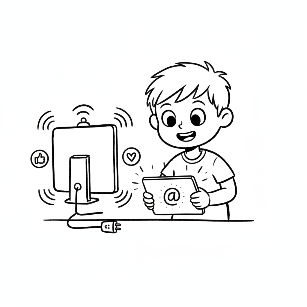 Lachender Junge nutzt Tablet und Computer, umgeben von Internet- und Social-Media-Symbolen.