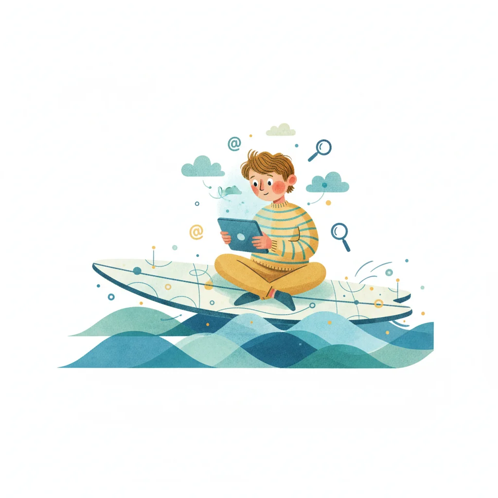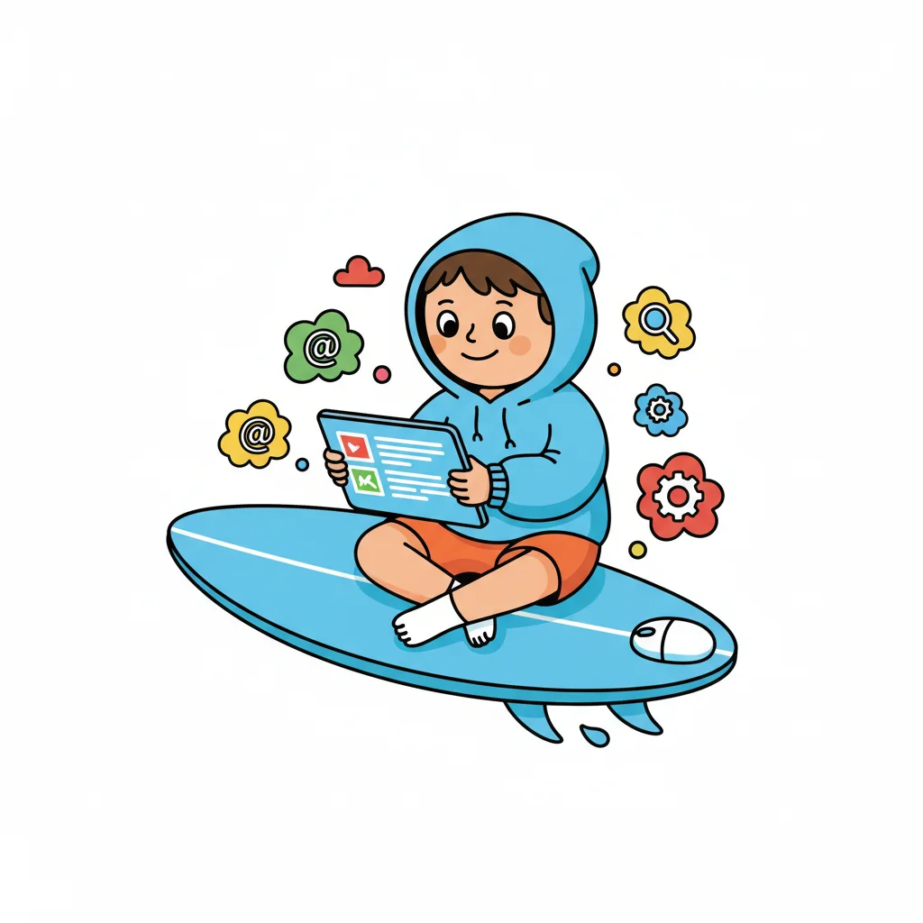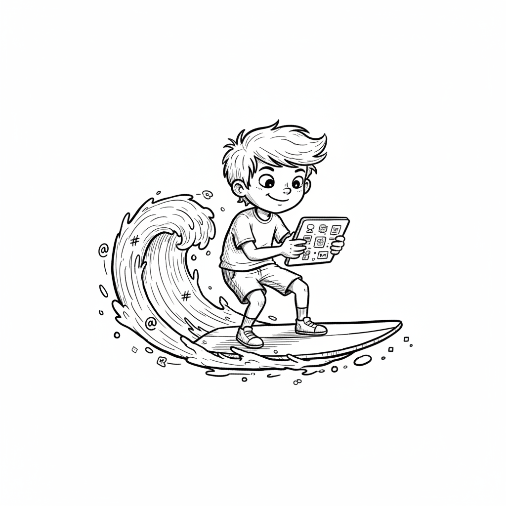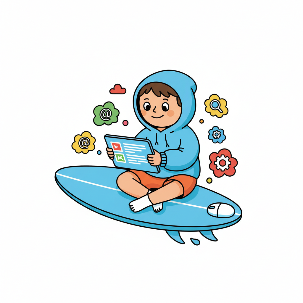 Junge sitzt auf Surfbrett, nutzt Tablet, umgeben von Internetsymbolen und Wolken.