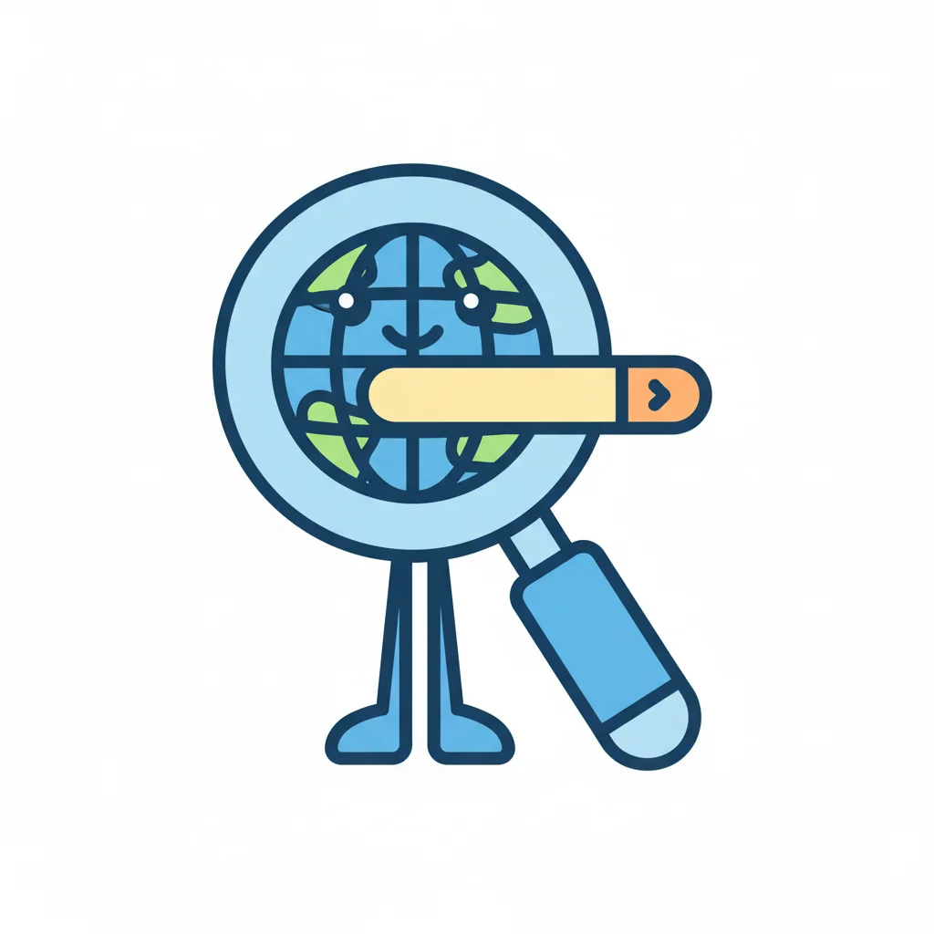 Illustration einer Lupe mit Globus, Suchleiste und Beinen, symbolisiert globale Suche.