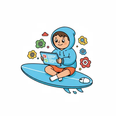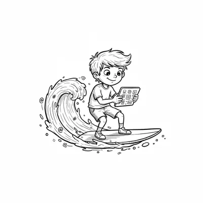 Ein Kind surft auf einem Surfbrett im Internet, umgeben von App-Symbolen.