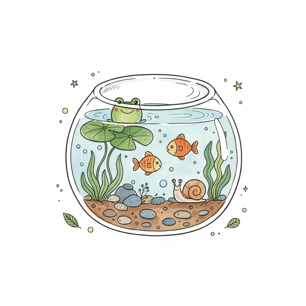 Niedliches Aquarium mit Frosch, Fischen, Schnecke und Pflanzen im Cartoon-Stil.