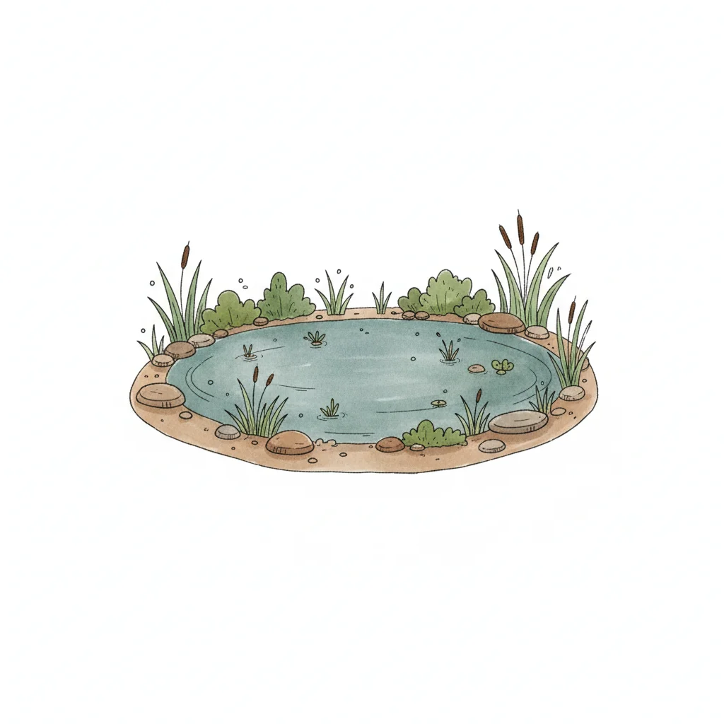Illustration eines Teiches mit Wasserpflanzen, Schilf und Steinen am Ufer in Aquarell-Optik.
