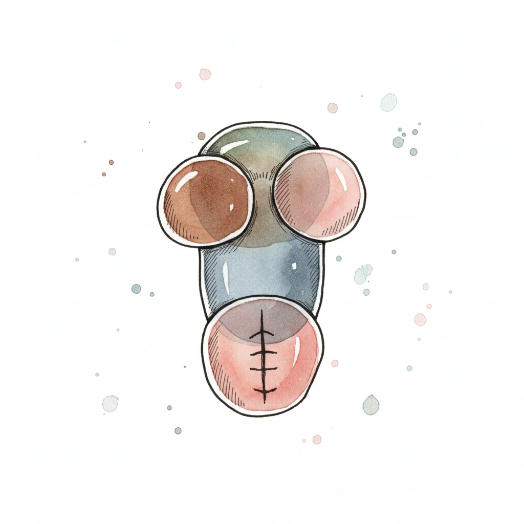 Aquarell-Illustration von stilisierten männlichen Genitalien in Blau-, Braun- und Rosatönen.