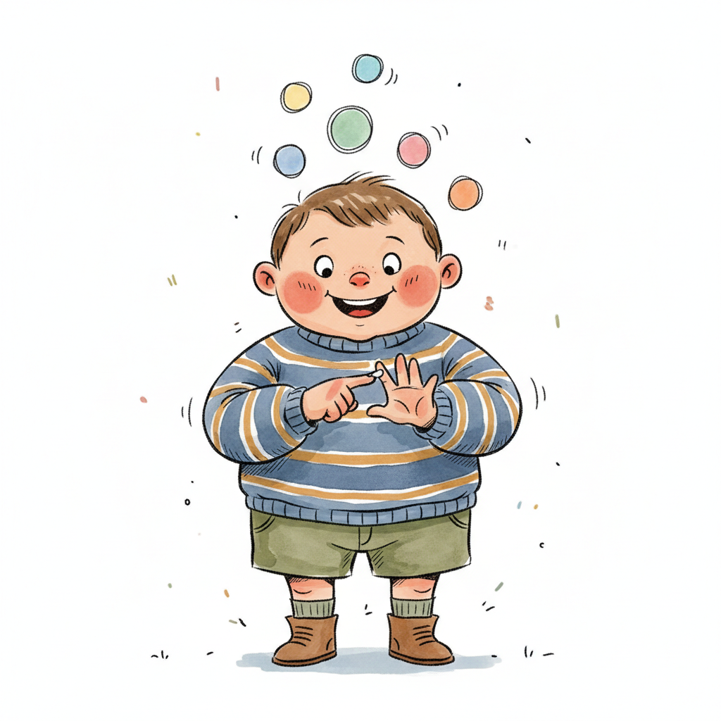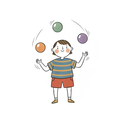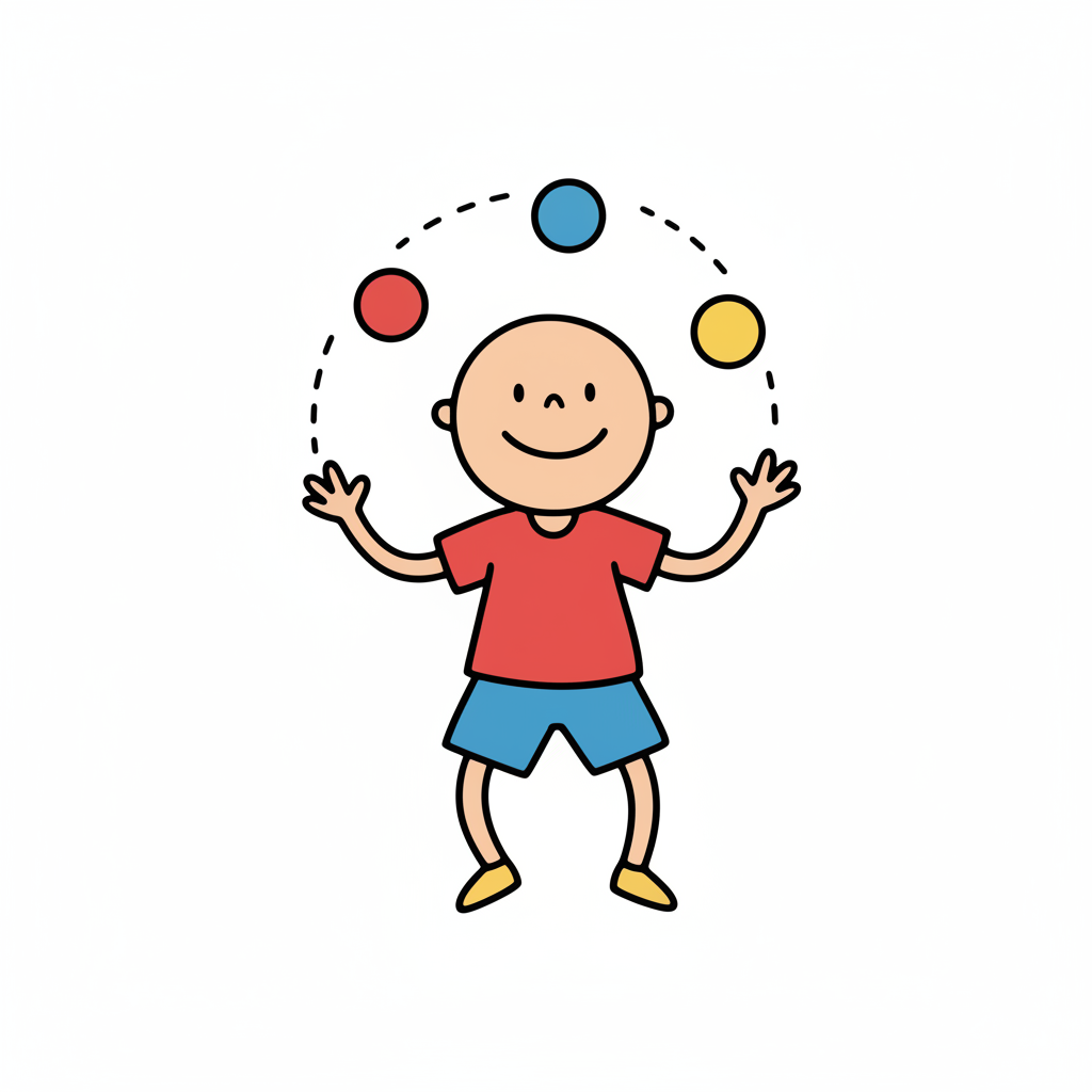 Ein Cartoon-Charakter jongliert mit bunten Bällen.