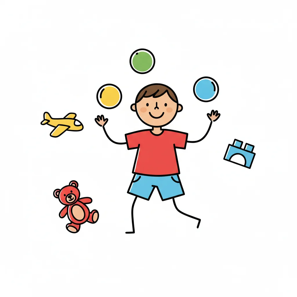 Ein lächelnder Junge jongliert mit bunten Bällen, umgeben von Spielzeug.