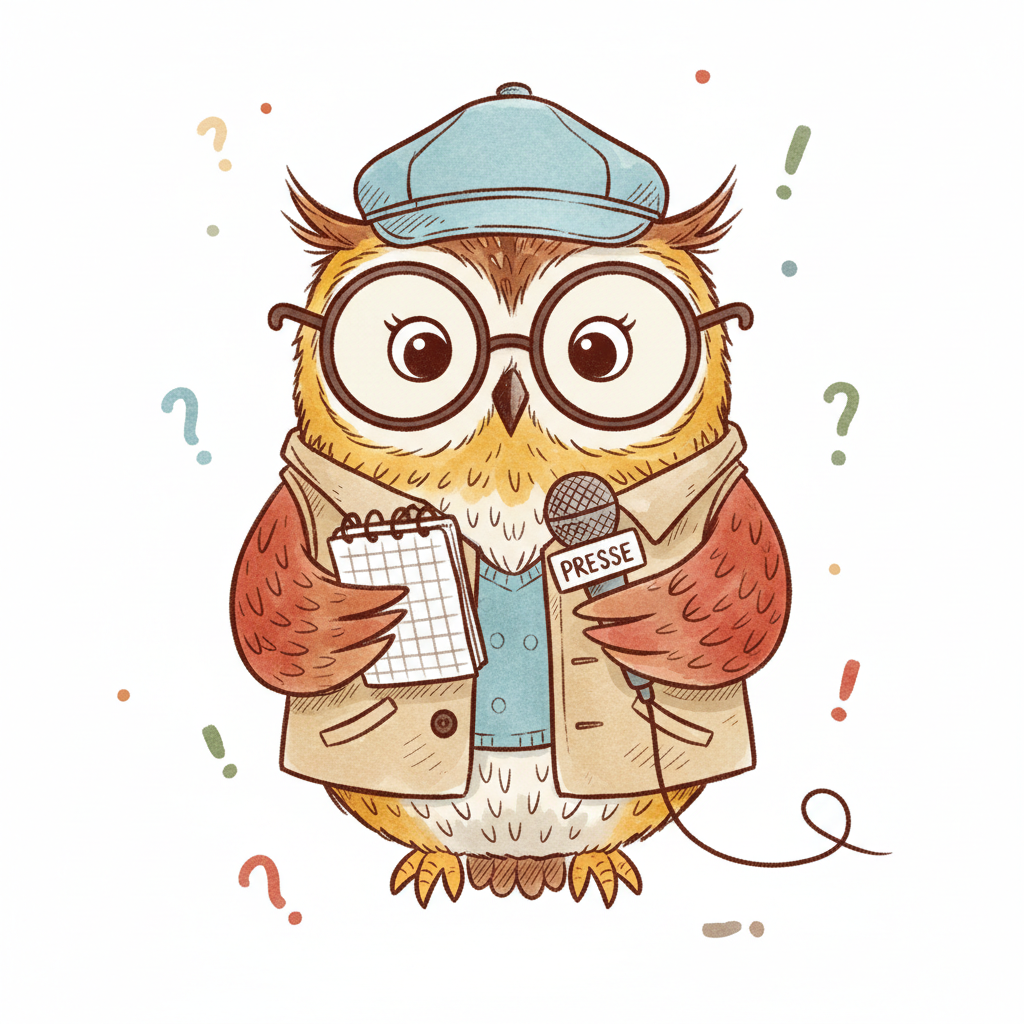 Niedliche Cartoon-Eule als Reporter mit Mikrofon, Notizblock und Brille, umgeben von Zeichen.