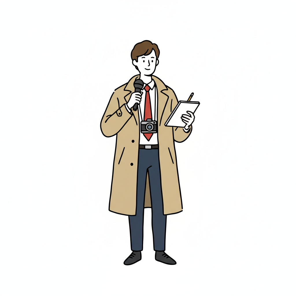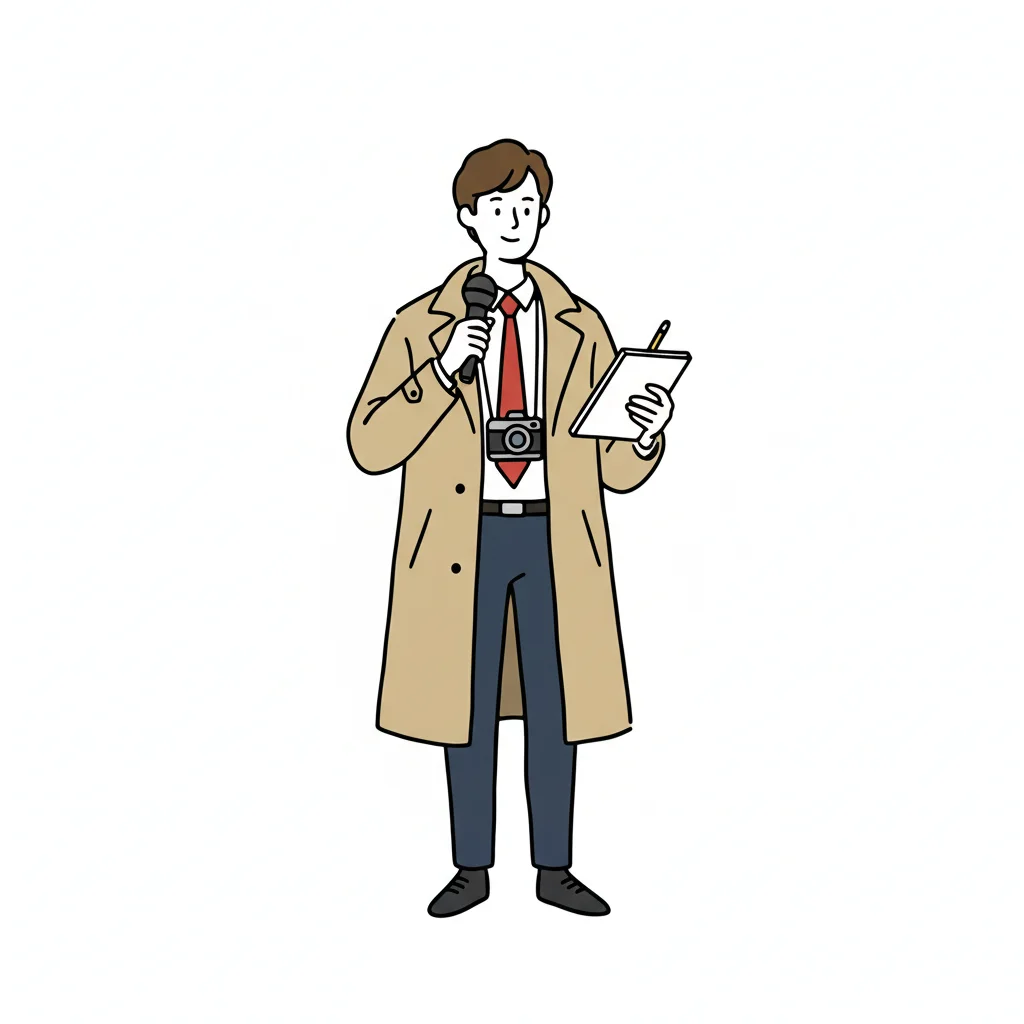 Illustration eines Reporters mit Mikrofon, Notizblock und Kamera in einem Trenchcoat.