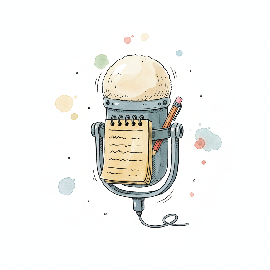 Illustration eines Mikrofons mit Notizblock und Bleistift, umgeben von Farbspritzern.
