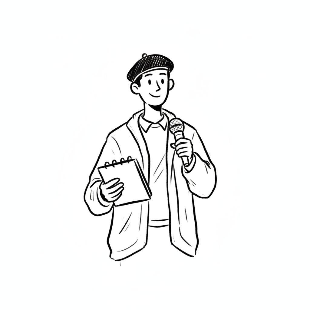 Schwarz-weiße Illustration eines Mannes mit Baskenmütze, Mikrofon und Notizbuch. Sieht aus wie ein Reporter.
