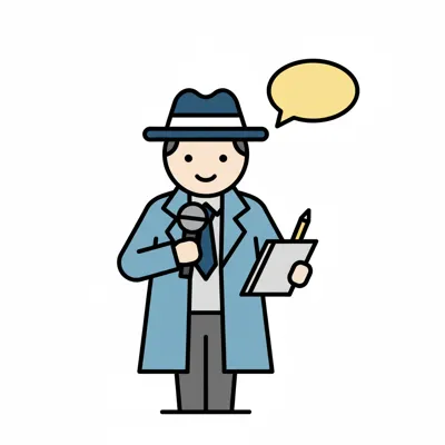 Illustration eines Reporters mit Hut, Mikrofon, Notizblock und Sprechblase.