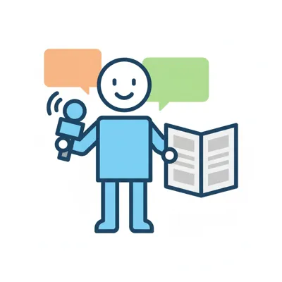Ein lächelndes Strichmännchen als Journalist mit Mikrofon, Zeitung und Sprechblasen.