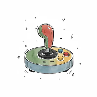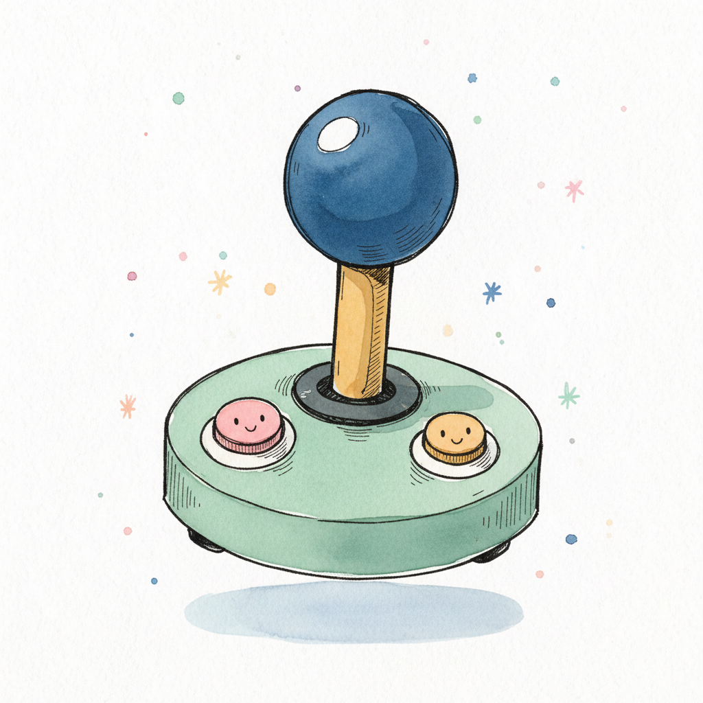 Buntes, handgezeichnetes Retro-Joystick-Symbol im Aquarellstil mit spielerischen Details.