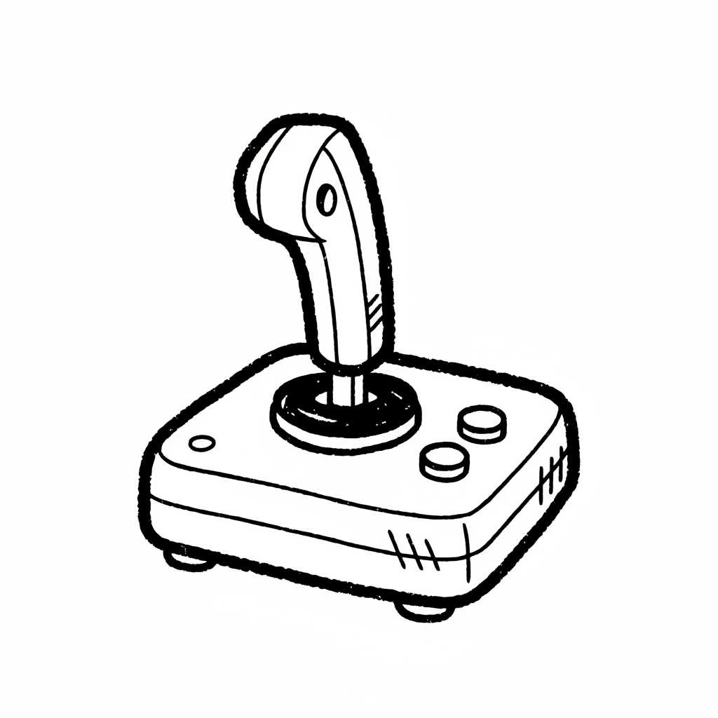 Schwarz-weiße Strichzeichnung eines Retro-Joysticks mit zwei Knöpfen.