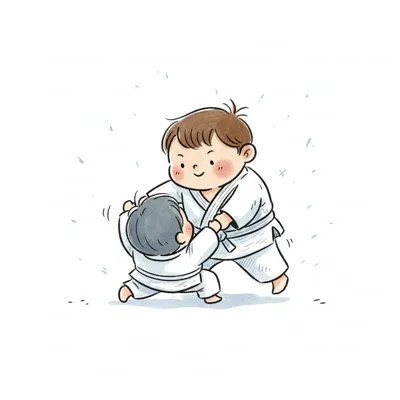 Zwei Kinder in Judogi kämpfen spielerisch miteinander.