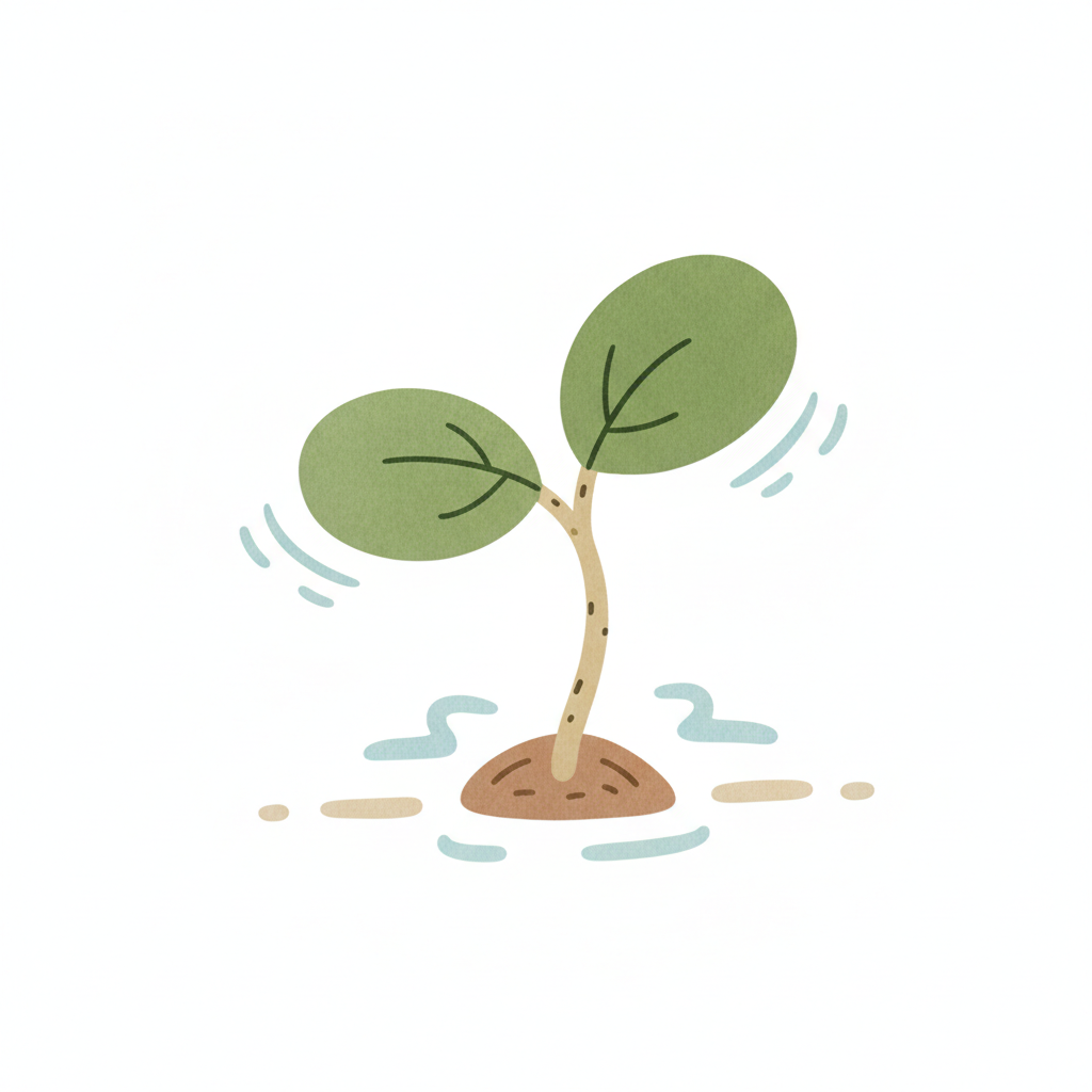 Niedliche Illustration eines jungen grünen Keimlings mit zwei Blättern, der aus der Erde sprießt.