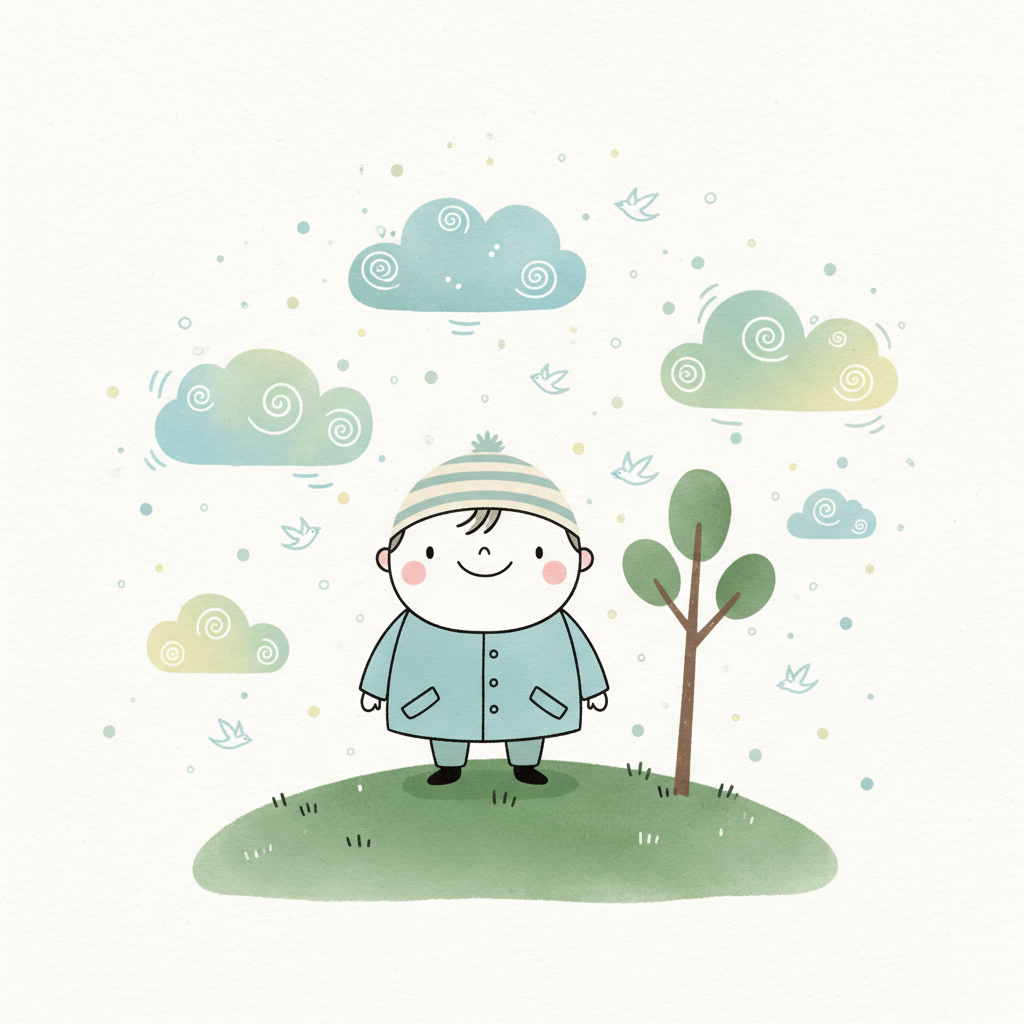 Illustration eines lächelnden Jungen auf einem Hügel mit Baum und Wolken im sanften Aquarellstil.
