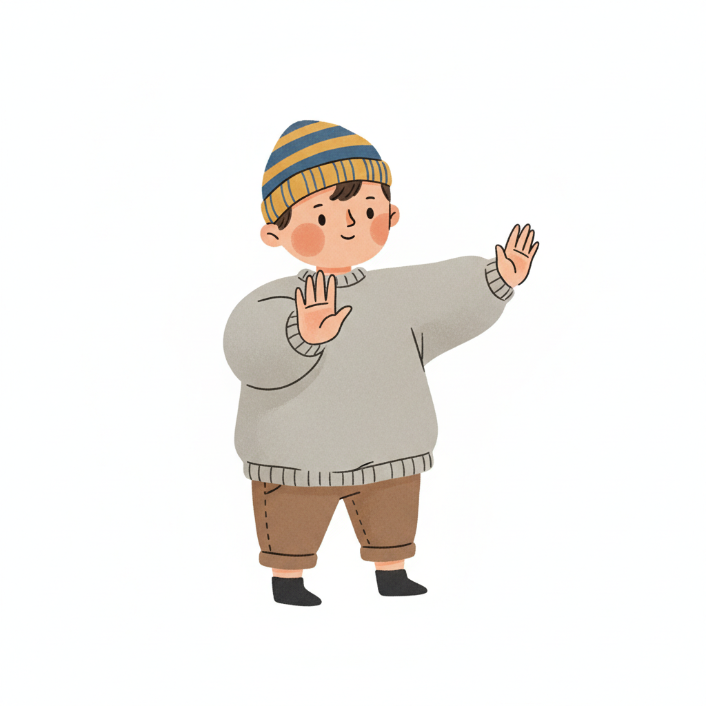 Niedliche Cartoon-Illustration eines Jungen mit Mütze, der beide Hände zum Stoppzeichen hebt.