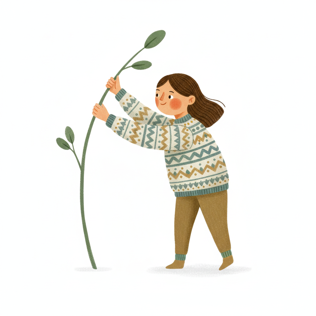 Ein lächelndes Mädchen in einem gemusterten Pullover hält einen jungen Pflanzenstiel mit Blättern.
