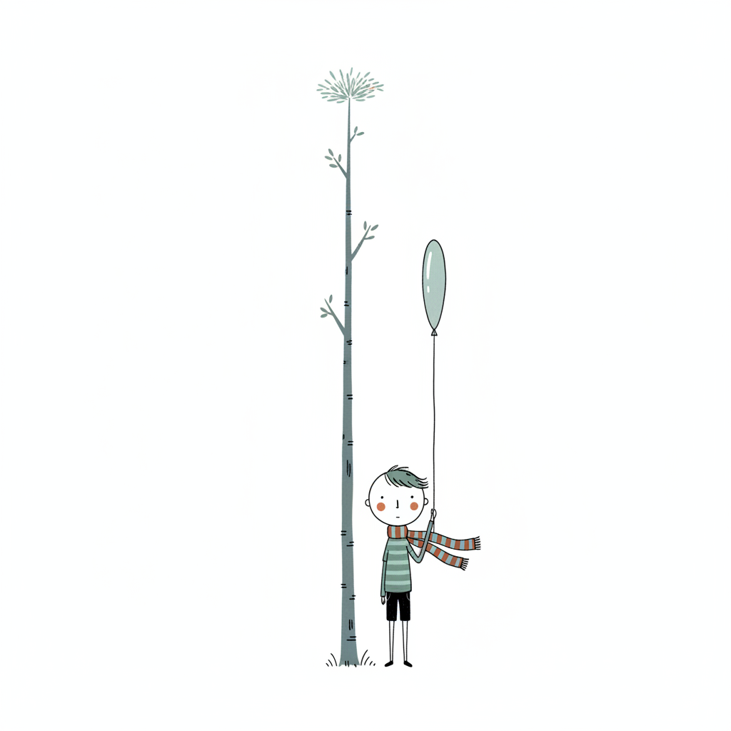Niedliche Illustration eines Jungen mit Schal und Ballon neben einem hohen Baum auf weißem Grund.