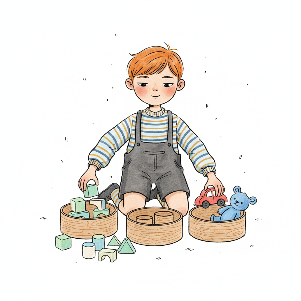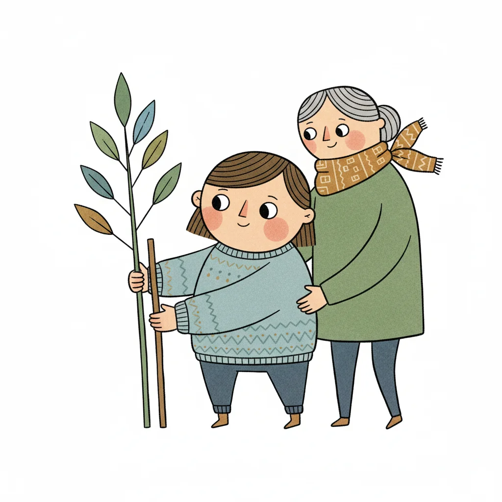 Handgezeichnete Kinderbuchillustration im modernen skandinavisch-nordischen Stil. Minimalistische, freundliche mit einfachen Formen und leicht unregelmäßigen, handgezeichneten Linien. Ruhige, gedeckte Farbpalette, viel freie Fläche, reduzierte Details, sanfte Papier- oder Aquarellstruktur. Warme, ruhige, leicht humorvolle Stimmung, flächige Komposition ohne starke Perspektive, moderner nordischer Illustrationsstil, charmant und zeitlos. Hoher Kontrast, isoliert auf weißem Hintergrund. WICHTIG: KEIN TEXT im Bild. Hintergrund: Rein weiß.