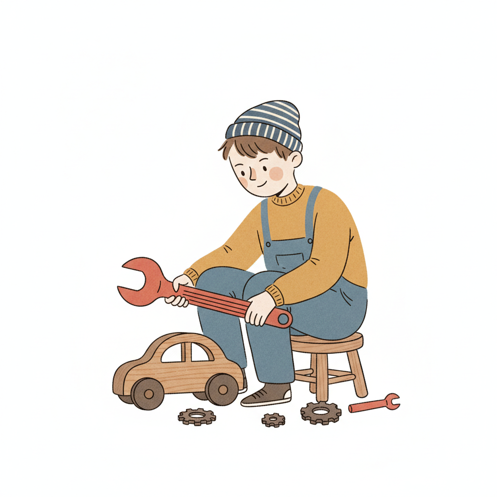 Cartoon eines Jungen, der ein Holzauto mit Werkzeug repariert.