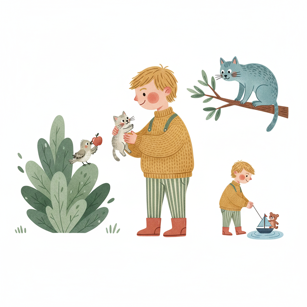 Niedliche Illustration eines Jungen, der mit Tieren interagiert und mit einem Spielzeugboot spielt.