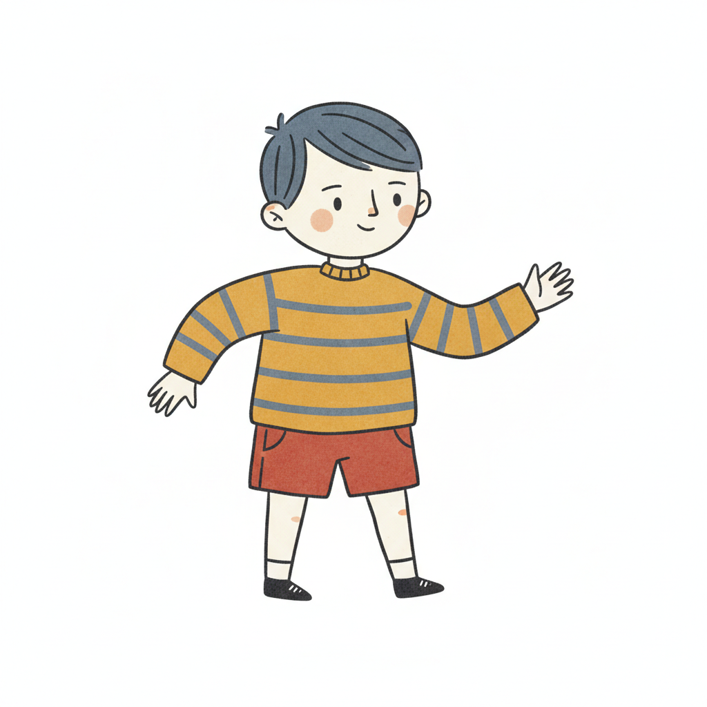 Niedliche Cartoon-Illustration eines lächelnden Jungen in gestreiftem Pullover und roten Shorts.
