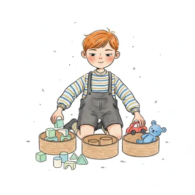 Niedliche Illustration eines Jungen mit roten Haaren, der auf dem Boden mit Bauklötzen und Spielzeug spielt.
