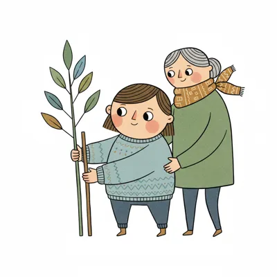 Ein Kind und eine ältere Frau halten einen jungen Baum, bereit zum Pflanzen. Eine Geste der Fürsorge.