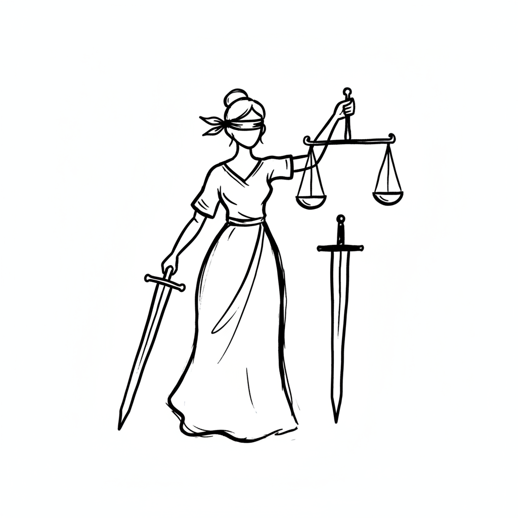 Stilisierte Justitia mit verbundenen Augen, Waage und Schwert, symbolisiert Gerechtigkeit.