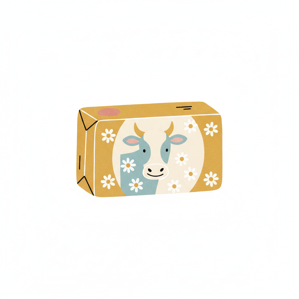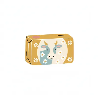 Eine Käseschachtel mit einer Kuh und Blumenmuster.