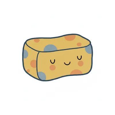 Käseblock mit einem lächelnden Gesicht und bunten Punkten.