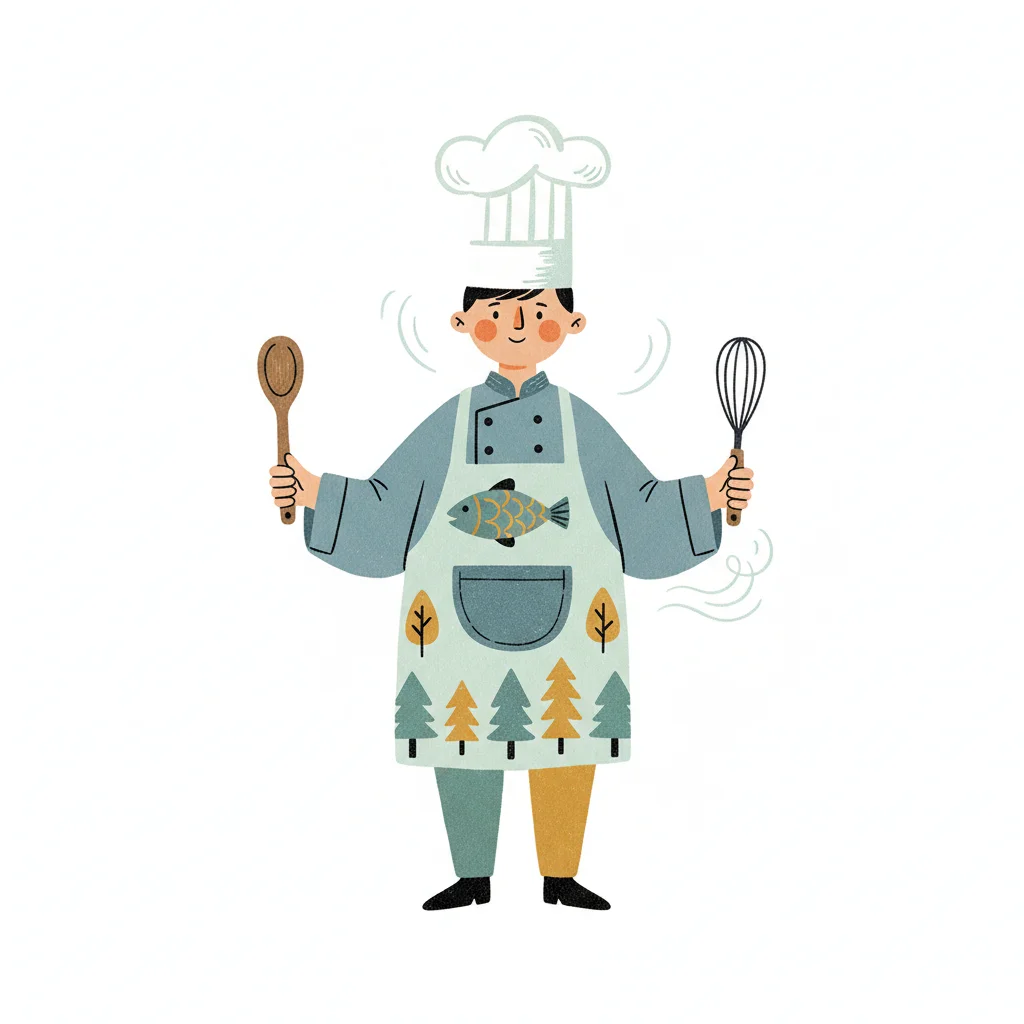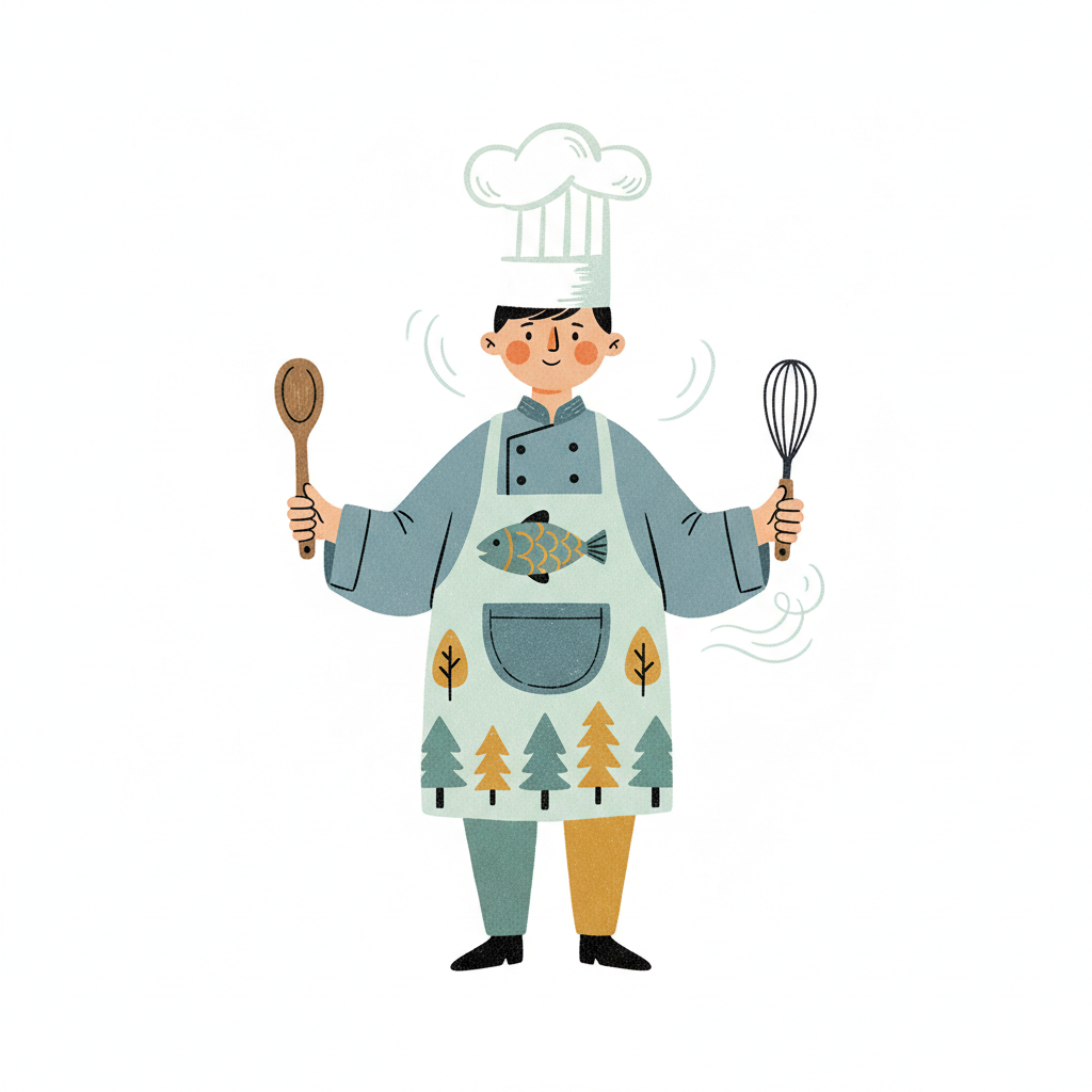 Illustration eines lächelnden Kochs mit Kochmütze, Schürze, Kochlöffel und Schneebesen.
