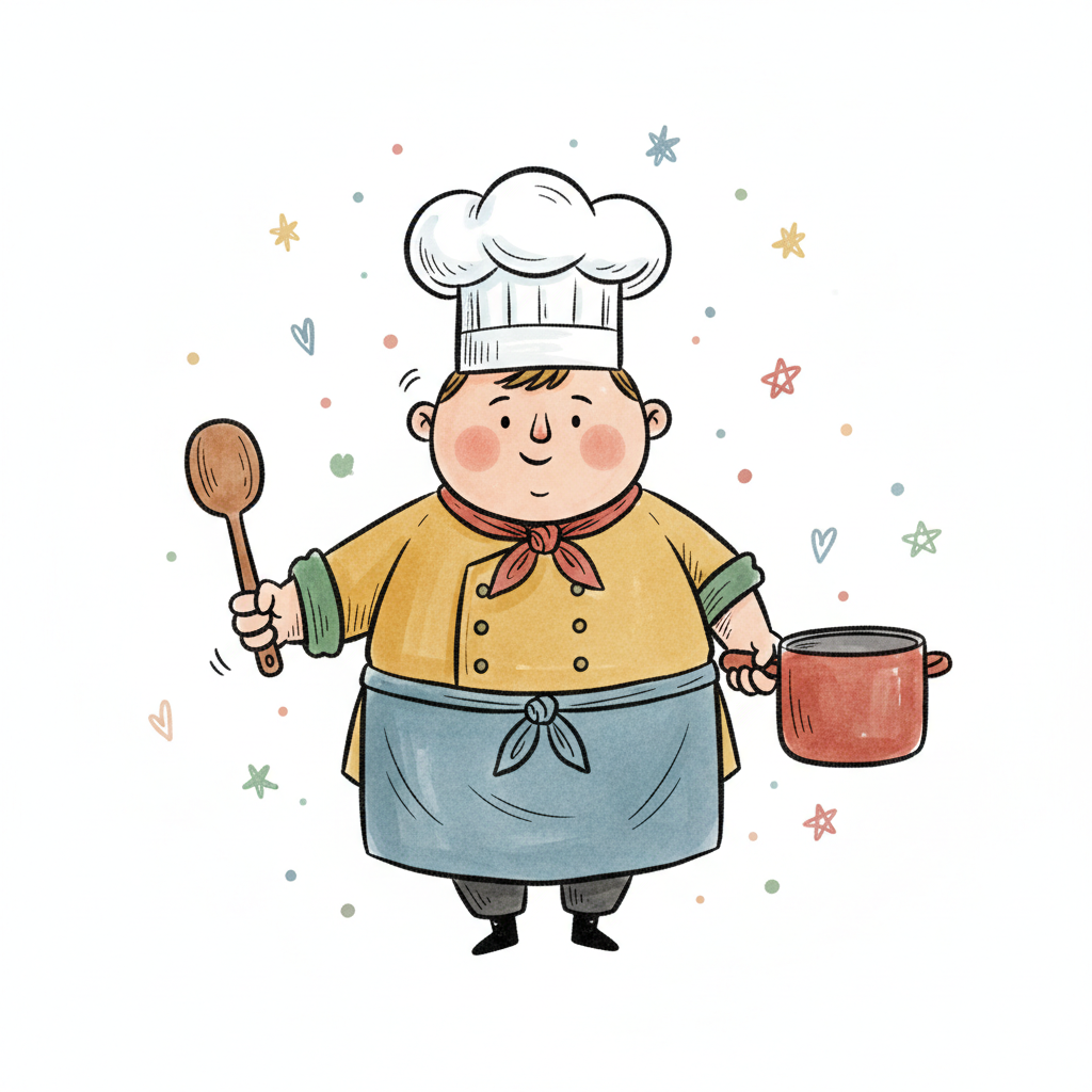 Niedlicher Cartoon-Koch mit Kochmütze, Löffel und Topf in den Händen, vor verspieltem Hintergrund.