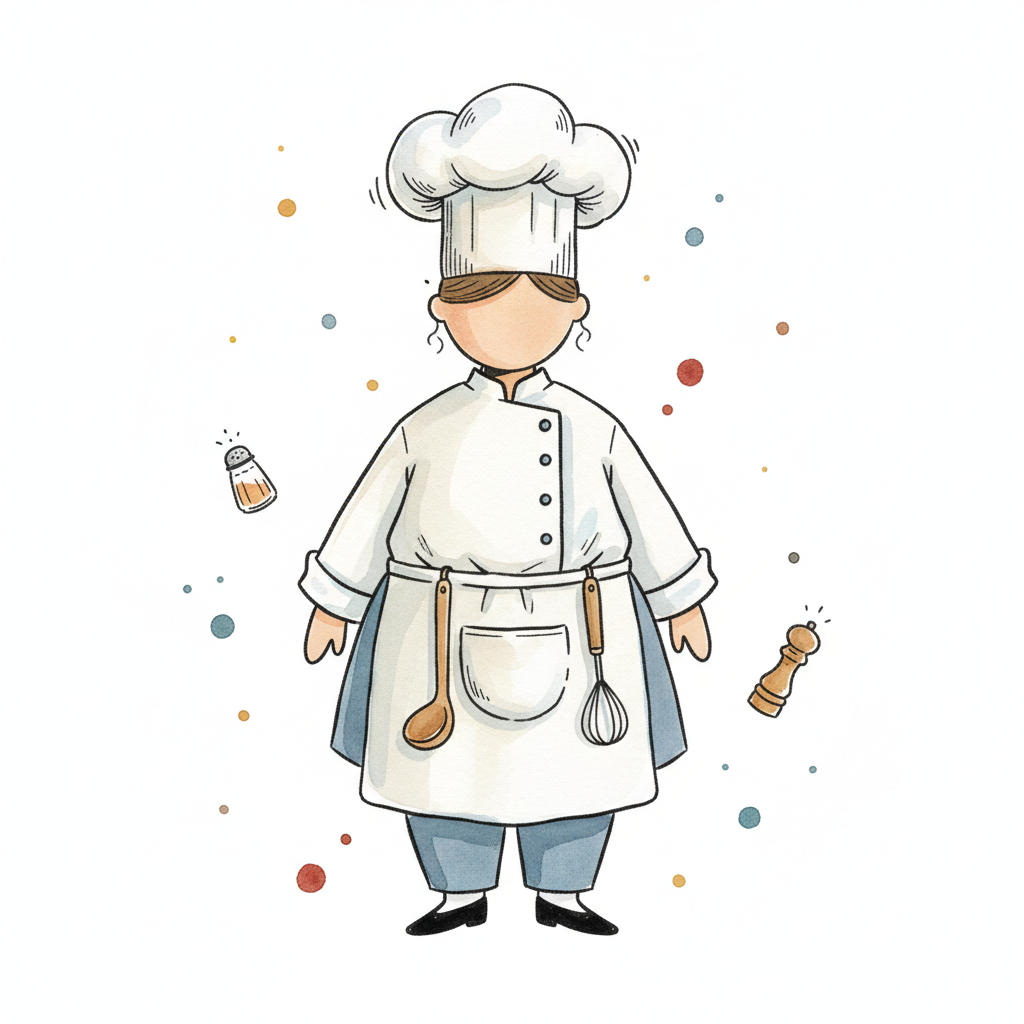 Niedliche Cartoon-Illustration eines Kochs mit Kochmütze, Löffel, Schneebesen, Salz- und Pfefferstreuer.
