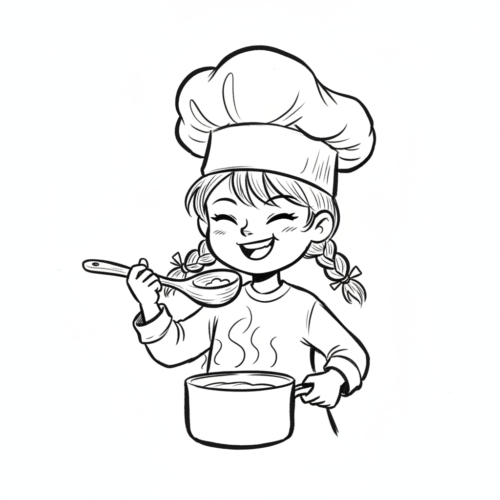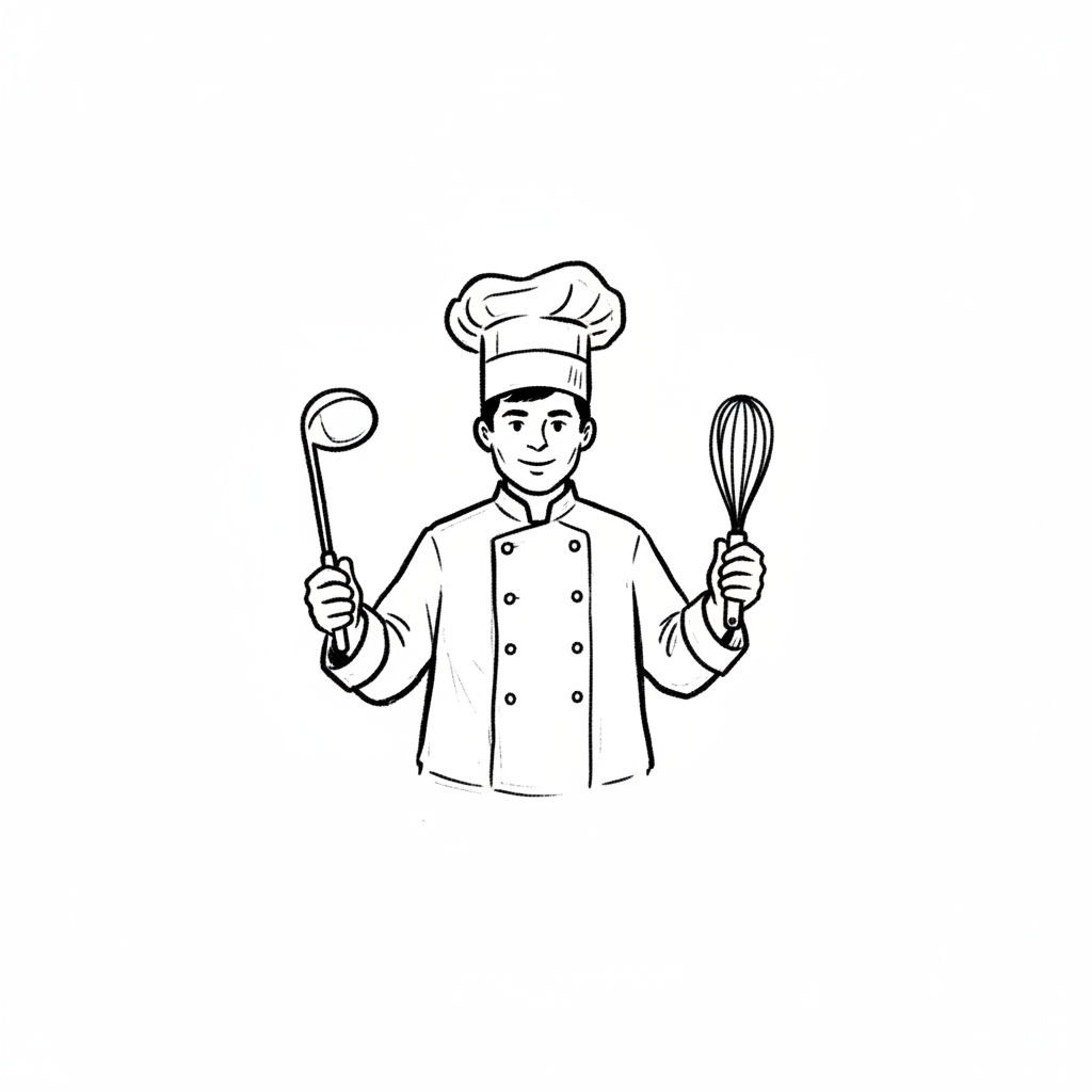 Schwarz-weiß-Illustration eines lächelnden Kochs in Uniform mit Schöpfkelle und Schneebesen.