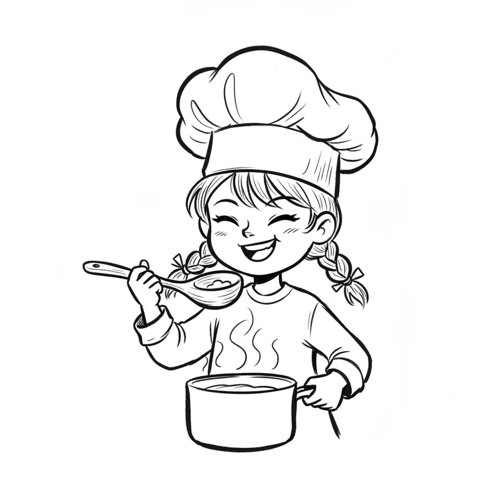 Fröhliches Mädchen als kleine Köchin mit Kochmütze, probiert aus einem dampfenden Topf. Schwarz-Weiß.