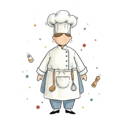 Illustration eines lächelnden Kochs mit Kochmütze, Schürze und Pfannenwender.