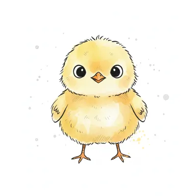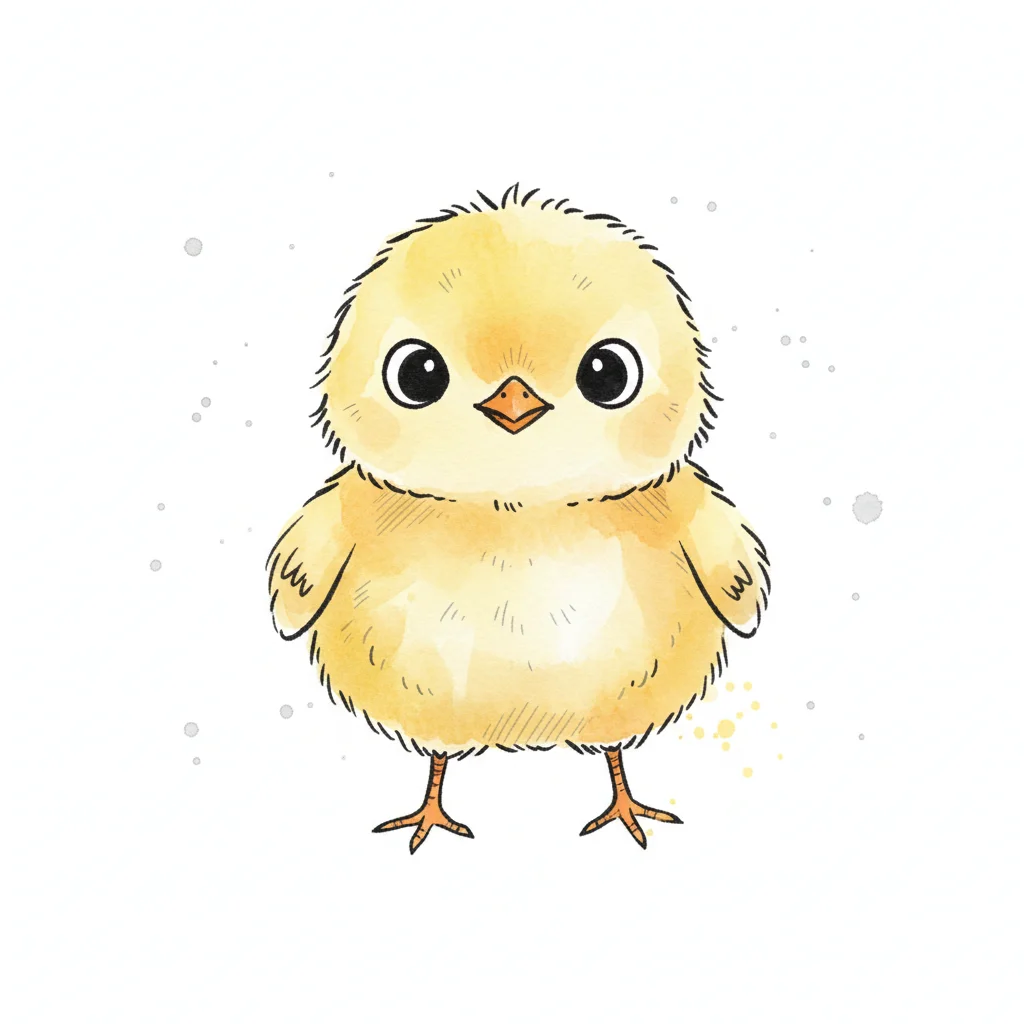 Eine niedliche, cartoonartige gelbe Kükenfigur auf weißem Hintergrund.